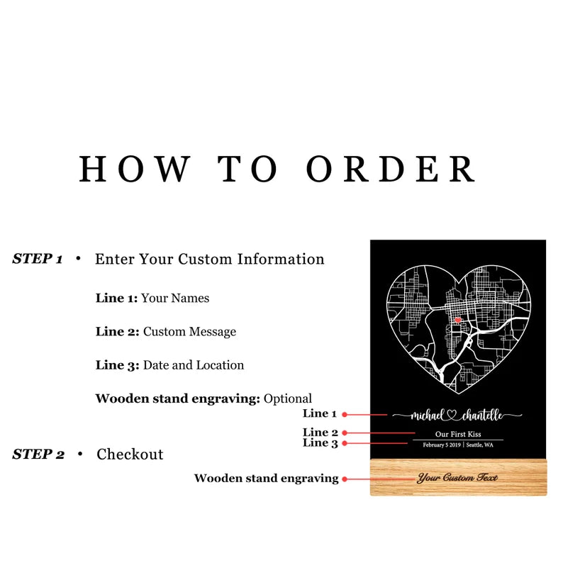 A personalized map print highlighting the location where you first met, customized with your names and date, all put together on a wooden light stand.